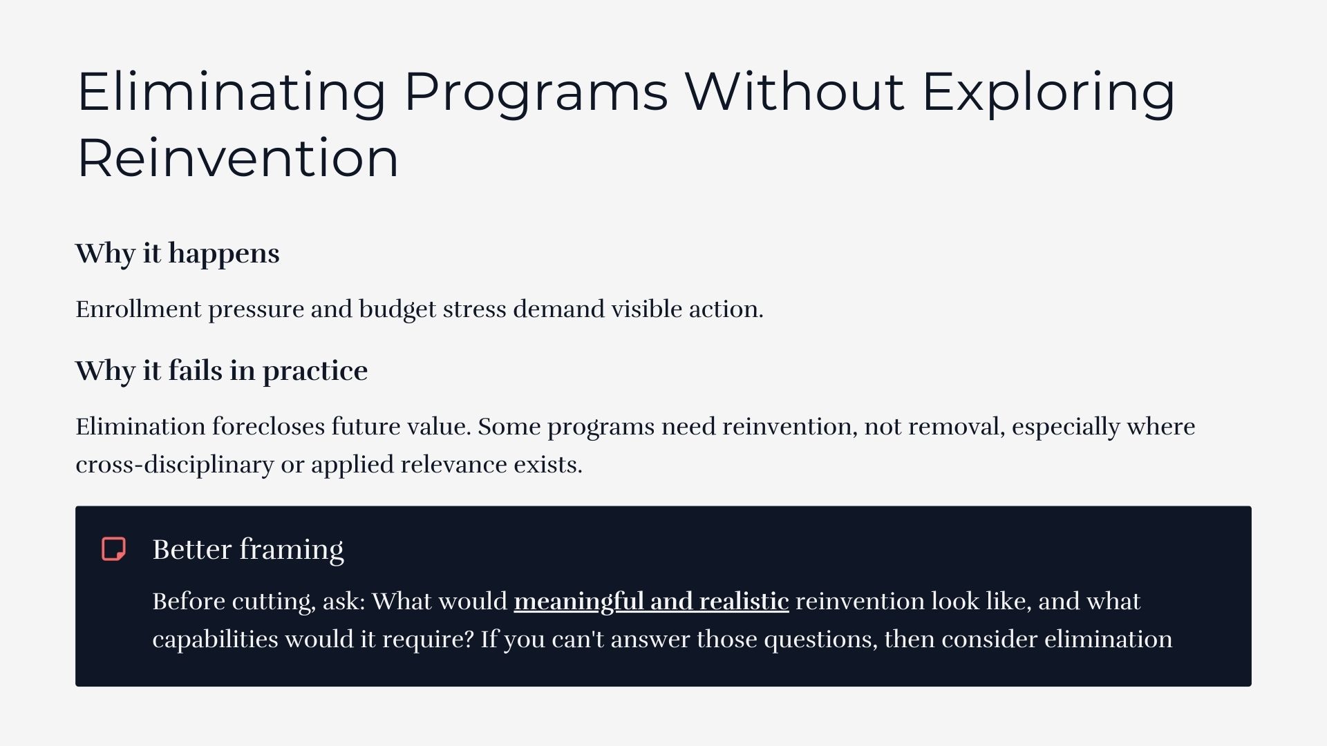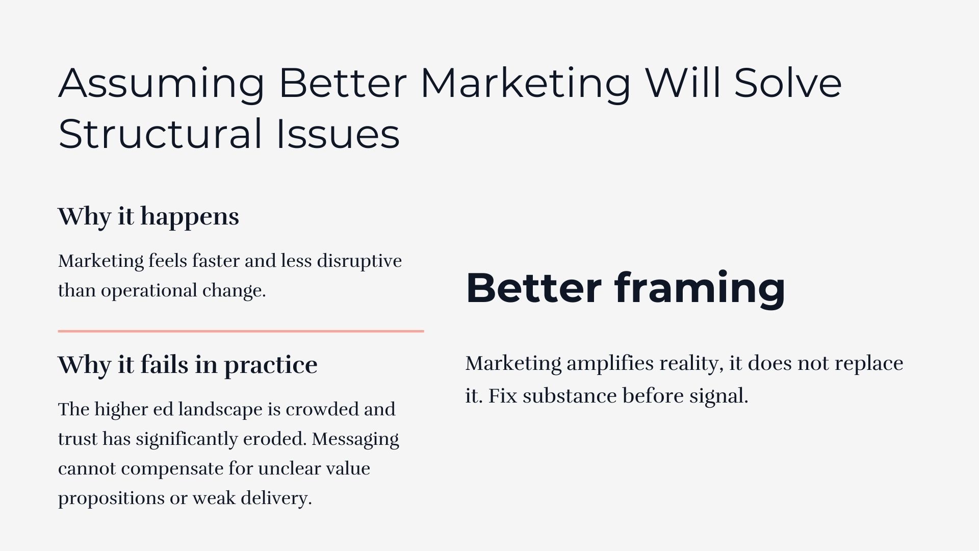 Democratizing understanding: When trade-offs and bets are shared openly, they allow departments and stakeholders to provide input, challenge assumptions, and adjust execution in real time. This creates a shared mental model of the institution’s direction rather than a top-down mandate. It forces choice instead of meandering, abstract debate.